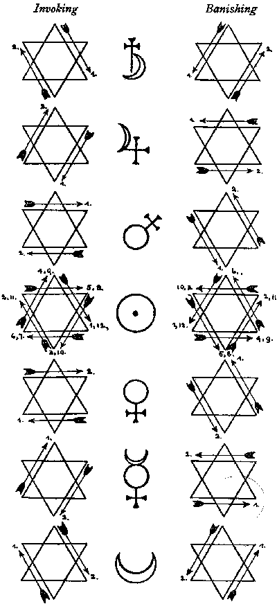The Hexagram of Earth alone is used. Draw the hexagram, beginning from the point which is attributed to the planet you are dealing with. (See "777" col. lxxxiii).