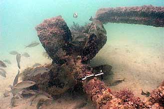 Localizado a 20 kilómetros de la costa y una profundidad de ocho metros, el buque conocido entre los lugareños como El Pesquero, presenta un alto grado de concreción.