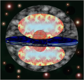 The stars in the binary system are much too small to be visible, but spectropolarimetry reveals that ejecta from an exploding white dwarf in SN 2002ic (dark red) is interacting with surrounding matter from a companion star, distributed primarily in the disk (dark blue); hydrodynamic shocks keep the supernova luminous nearly a year after its explosion. Outside the disk the density of the circumstellar matter is lower (gray). (Illustration: Wang)