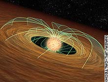 Astronomers theorize that the disk slows the spinning star by pulling on its magnetic fields. When these fields pass through a dust disk, they are believed to get stuck "like a spoon in molasses," the researchers' statement said.
