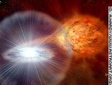The star is a stellar corpse the size of Earth, known as a white dwarf, and it is paired in a binary system with a red giant, a dying, bloated star that once resembled our sun. The red giant has been dumping gas onto the surface of the white dwarf, and every few years, enough matter accumulates to set off a giant thermonuclear explosion.