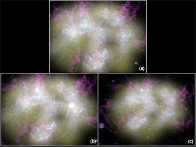 These animation stills show a typical young galaxy, teeming with hot, newborn stars and exploding supernovas. The supernovas are seen as white flashes of light. Credit: NASA/JPL-Caltech |