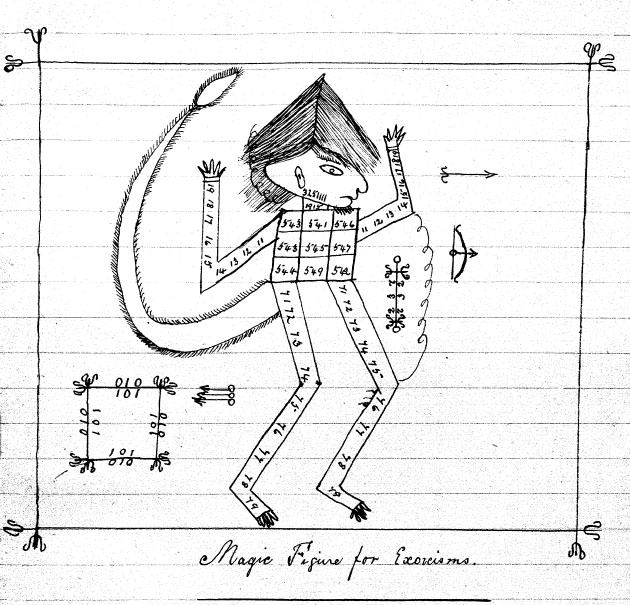 3. Phrases are sometimes omitted or abbreviated such as on leaf 5 and again on leaf 7, leaf 9, leaf 12, and leaf 13 where the symbol "(N + + + +) is used instead of the phrase "N. milliones optimi auri et expensibilis ubique [leaf 5 leaves out the "ubique"] monetae hispanicae." This same concept is given another expression on leaf 19 where the phrase "that which I desire" takes the place of the Latin, "nonaginta novem millia dimidium scutatorum et duplonorum in auri monetis cursivis." Other phrases are added such as the lengthy one at the bottom of leaf 6: I . N. do cite thee spirit of Iayariel to appear before me though aroram Lasunabula Sol Jesus Christus the victor by Schehostia Schelam Jehova Votmehasehla Schebevek adonay Proemischoea avit By the wonderous power of the names agla Schaffort. And by the great spirit Jehova Podashocheia (Leaf 6).