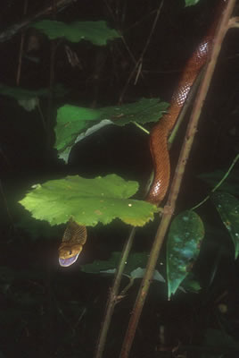 Many Malagasy snakes have spiritual (often ancestral) attributes but the spear-headed fandrefiala is certainly the most feared. “It’s very clever,” Eloi explained, “if you stop under his tree it will drop three leaves, one at a time, onto your head. It does this to check the trajectory. Then it drops out of the tree and springs its body straight like a spear to kill you.” But the ‘clever’ fandrefiala invariably kills itself in the collision. Another guide told me about a fandrefiala that missed its target and broke a metal rice pot. It also died.