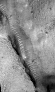 • An image from the Mars Global Surveyor is said on Hoagland's site to be a gargantuan, glass-like worm that's a mile long. Plain as a pig in the clouds, the image does indeed evoke the shape and features of a worm at the bottom of a canyon. Evenly spaced arcs even resemble ribs. Plait says the most likely explanation for the rib-like features is that they're sand dunes, created by wind blowing through the valley.
