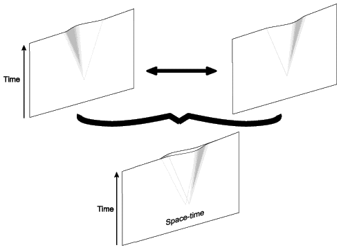 A bifurcating space-time is depicted in the lowest of the three diagrams, this being the union ("glued together version") of the two alternative space-time histories that are depicted at the top of Figure 1. The initial part of each space-time is at the lower end of each individual space-time diagram. The bottom space-time diagram (the bifurcating one) illustrates two alternative mass distributions actually in quantum superposition, whereas the top two illustrate the two individual alternatives which take part in the superposition. The combined space-time describes a superposition in which the alternative locations of a mass move gradually away from each other as we proceed in the upward direction in the diagram. Quantum- mechanically (so long as OR has not taken place), we must think of the "physical reality" of this situation as being illustrated as an actual superposition of these two slightly differing space-time manifolds, as indicated in the bottom diagram. As soon as OR has occurred, one of the two individual space-times takes over, as depicted as one of the two sheets of the bifurcation. For clarity only, the bifurcating parts of these two sheets are illustrated as being one convex and the other concave. Of course there is additional artistic license involved in drawing the space-time sheets as 2-dimensional, whereas the actual space-time constituents are 4-dimensional. Moreover, there is no significance to be attached to the imagined "3-dimensional space" within which the space-time sheets seem to be residing. There is no "actual" higher dimensional space there, the "intrinsic geometry" of the bifurcating space-time being all that has physical significance. When the "separation" of the two space-time sheets reaches a critical amount, one of the two sheets "dies" - in accordance with the OR criterion - the other being the one that persists in physical reality. The quantum state thus reduces (OR), by choosing between either the "concave" or "convex" space-time of Figure 1. It should be made clear that this measure of separation is only very schematically illustrated as the "distance" between the two sheets in the lower diagram in Figure 1. As remarked above, there is no physically existing "ambient higher dimensional space" inside which the two sheets reside. The degree of separation between the space-time sheets is a more abstract mathematical thing; it would be more appropriately described in terms of a symplectic measure on the space of 4-dimensional metrics (cf. Penrose, 1993) - but the details (and difficulties) of this will not be important for us here. It may be noted, however, that this separation is a space-time separation, not just a spatial one. Thus the time of separation contributes as well as the spatial displacement. Roughly speaking, it is the product of the temporal separation T with the spatial separation S that measures the overall degree of separation, and OR takes place when this overall separation reaches the critical amount. [This critical amount would be of the order of unity, in absolute units, for which the Planck-Dirac constant h bar (=h/2ã), the gravitational constant G, and the velocity of light c, all take the value unity, cf. Penrose, 1994 - pp. 337-339.] Thus for small S, the lifetime T of the superposed state will be large; on the other hand, if S is large, then T will be small. To calculate S, we compute (in the Newtonian limit of weak gravitational fields) the gravitational self-energy E of the difference between the mass distributions of the two superposed states. (That is, one mass distribution counts positively and the other, negatively; see Penrose, 1994; 1995.) The quantity S is then given by: |