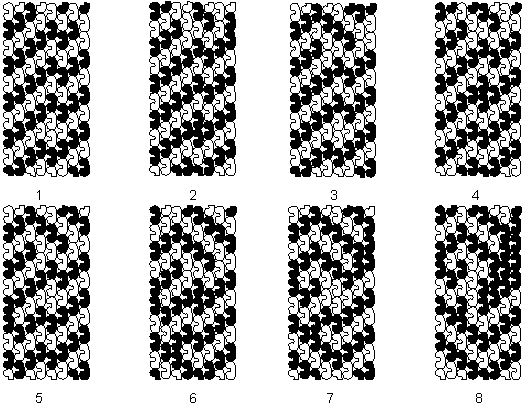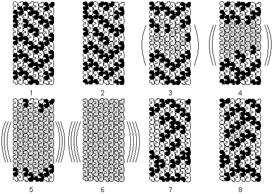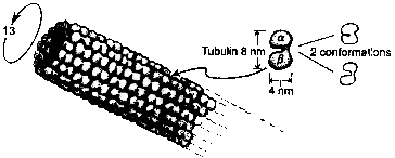 | MTs are hollow cylinders 25 nanometers (nm) in diameter whose lengths vary and may be quite long within some nerve axons. MT cylinder walls are comprised of 13 longitudinal protofilaments which are each a series of subunit proteins known as tubulin (Figure 3). Each tubulin subunit is a polar, 8 nm dimer which consists of two slightly different 4 nm monomers (alpha and beta tubulin - Figure 4). Tubulin dimers are dipoles, with surplus negative charges localized toward monomers (DeBrabander, 1982), and within MTs are arranged in a hexagonal lattice which is slightly twisted, resulting in helical pathways which repeat every 3, 5, 8 and other numbers of rows. Traditionally viewed as the cell's "bone-like" scaffolding, microtubules and other cytoskeletal structures also appear to fill communicative and information processing roles. Numerous types of studies link the cytoskeleton to cognitive processes (for review, cf. Hameroff and Penrose, 1996). Theoretical models and simulations suggest how conformational states of tubulins within microtubule lattices can interact with neighboring tubulins to represent, propagate and process information as in molecular-level "cellular automata," or "spin glass" type computing systems (Figure 5; e.g. Hameroff and Watt, 1982; Rasmussen et al, 1990; Tuszynski et al, 1995). |