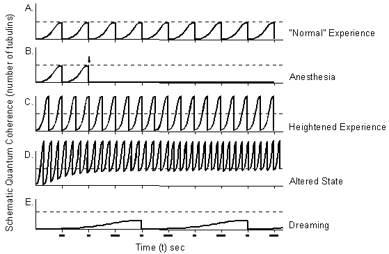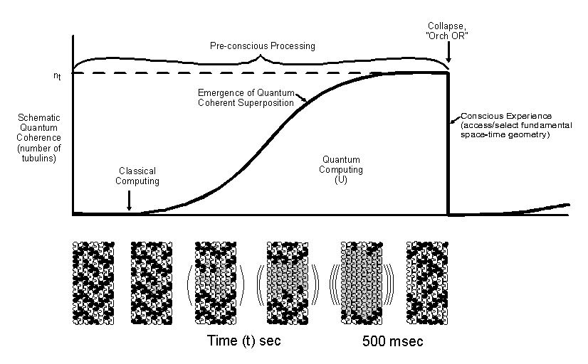 (Marshall, 1989) might also participate. Properties of brain structures suitable for quantum coherent superposition, OR and relevant to consciousness might include: 1) high prevalence; 2) functional importance (for example regulating neural connectivity and synaptic function); 3) periodic, crystal-like lattice dipole structure with long range order; 4) ability to be transiently isolated from external interaction/observation; 5) functionally coupled to quantum-level events; 6) hollow, cylindrical (possible wave guide); and 7) suitable for information processing. Membranes, membrane proteins, synapses, DNA and other types of structures have some, but not all, of these characteristics. Cytoskeletal microtubules appear to qualify in all respect. |
