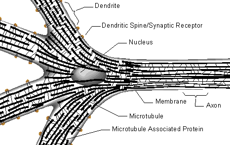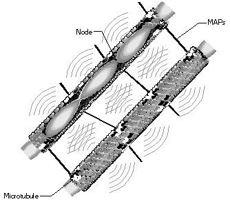 | Interiors of living cells, including the brain's neurons, are spatially and dynamically organized by self-assembling protein networks: the cytoskeleton. Within neurons, the cytoskeleton establishes neuronal form, and maintains and regulates synaptic connections. Its major components are microtubules, hollow cylindrical polymers of individual proteins known as tubulin. Microtubules ("MTs") are interconnected by linking proteins (microtubule-associated proteins: "MAPs") to other microtubules and cell structures to form cytoskeletal lattice networks (Figure 2). |