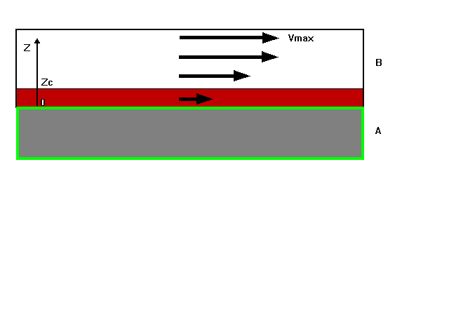 The lower layer (A) is not superconducting at the temperature of operation (slightly below 70 K). The relative velocity of the charge carriers with respect to the interface between the two layers is represented by thick arrows. It grows from zero to some velocity Vmax according to a power law.