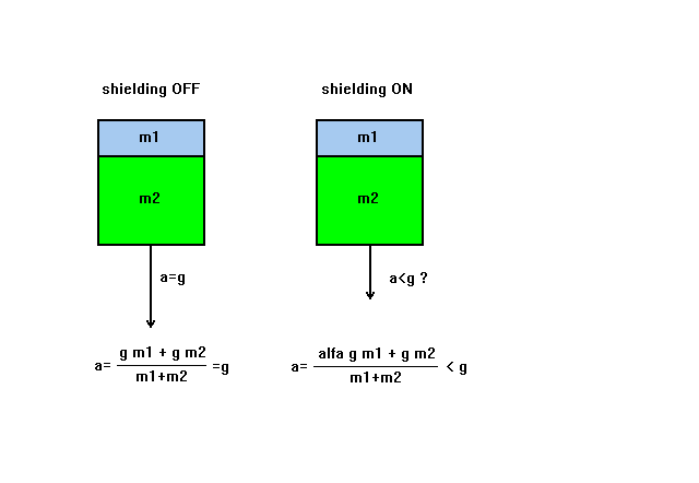 Then you "turn ON" the shielding, say with efficiency a ; this means that the gravitational force felt by the mass m1 over the apparatus is multiplied by a factor a <1 (for instance, a =0.98). Let us admit that the weight of m2 itself is not affected.