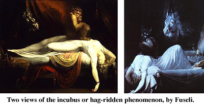 Another version of the succubus or incubus attack or rape occurs when the percipient awakens fully (at least mentally), can see and feel, but can't move a muscle. Medical Science refers to all such cases as "sleep paralysis," and states that the condition is due to an "awakened mental state, while the body is still asleep," or the person is in a "hypnogogic" state. While this may be true in some cases, there are those who maintain that this is not the case in their particular experiences. Often these incidents are accompanied by 'waking dreams' or 'hallucinations,' in which the victim feels, senses, or sees someone or something else in the room or beside the bed, or even feels a bodily or electrical pressure or weight descend upon them. A few female victims have reported actual physical intercourse with an unseen entity or group of entities, and this has, according to them, led to "rape" by invisible presences at later times, when alone and fully awake.