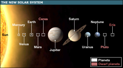 The "new" Solar System agreed at the IAU's General Assembly has eight planets - Mercury to Neptune - and at least three dwarf planets: Pluto, Eris and the largest asteroid in the Solar System, Ceres.