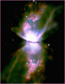 A structure that may resemble the progenitor of SN 2002ic: the NGC 6302 butterfly nebula is the remnant of a star that shed most of its outer layers before contracting, and may be one member of a binary system. The center of the system is obscured by a dark, dusty, disk-like structure, but radiation escaping perpendicular to the disk heats and illuminates the circumstellar material.