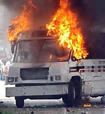 Agregó que los manifestantes quemaron seis autobuses de transporte publico y un camión cisterna.