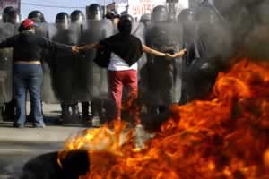 Luego de más de 12 minutos de ser sometidos a una lluvia de bombas molotov, cohetones y piedras por parte de presuntos estudiantes, la Policía Federal Preventiva (PFP) avanza sobre avenida Universidad, a un costado de la Plaza del Valle.