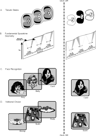 Figure 3. Orch OR events in conscious experience. a) (left) Three tubulins in quantum superposition prior to 25 msec Orch OR After reduction (right), particular classical states are selected. b) Fundamental spacetime geometry view. Prior to Orch OR (left), spacetime corresponding with three superposed tubulins is separated as Planck scale bubbles: curvatures in opposite directions. The Planckscale spacetime separations S are very tiny in ordinary terms, but relatively large mass movements (e.g., hundreds of tubulin conformations, each moving from 106 to 0.2 nm) indeed have precisely such very tiny effects on the spacetime curvature. A critical degree of separation causes Orch OR and an abrupt selection of single curvatures (and a particular geometry of experience). c) Cognitive facial recognition. A familiar face induces superposition (left) of three possible solutions (Amy, Betty, Carol) which "collapse" to the correct answer Carol (right). d) Cognitive volition. Three possible dinner selections (shrimp, sushi, pasta) are considered in superposition (left), and collapse via Orch OR to choice of sushi (right).