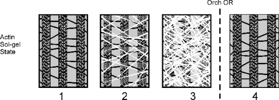 Figure Schematic sequence of phase of actin gelation/quantum isolation (13) and solution/environmental communication (4) around MT. Cycles may occur rapidly, e.g., 25 msec intervals (40Hz).