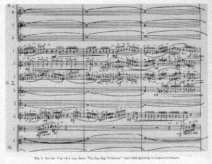 Roger stressed two things after finishing this account of his dream experience: First, he was emphatic that the lesson of the dream was given in the dream itself. It was already present as he woke up. Second, he was quick to point out that it was a lesson that would take him many years to apply fully. As he put it, "Of course, I didn't have the technique, but I got the principle." To bolster his point, Roger began excitedly to pull long sheets of paper with hand-scored lines of music from a large portfolio. At age 38, at The Ohio State University, Roger earned the DMA degree. His doctoral composition was titled "The Dancing Difference." These sheets, Roger explained, were the original sheets on which this composition had been created. With continuing excitement, he began to explain—and show—how the visual appearance of the notes on the page corresponded to the image of the trees with their musical note leaves. Early in the work, the notes literally appear on the page inclining this way and that (see Figure 1).