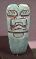 The slitted eyes and curved mouth are also shown in this small carving, so the human presence is felt here. The eyebrows are feathered like an eagle's brows - this figure may show the way the shaman's soul traverses the heavens with the power of the eagle's flight. From the shaman's perspective, the soul requires an animal medium - the nahual - to enter the various realms: the heavens, the earth, and the underworld. Notice the cinnabar tracing etched into the face; this mercury ore was a precious mineral for the Olmecs.