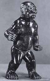 It is an almost black, little figurine of a man rising from one knee in the ecstasy of transformation. The transformation figure shows the human and feline characteristics brilliantly fused together. The head and ears remain human , but the crown of it¹s head is smooth , as if shaved. The features of it's face seem to flow into each other and the eye sockets are wide and deeply bored. Extended by incised lines above the eyes, the carved eyebrows are similar to flame eyebrows and signify the shedding of skin.