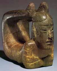 Olmec Ruler - or God - connected physical and spiritual worlds. His pose represents his means to link with the supernatural worlds. The turned down mouth, a feline feature, suggests that the human ruler was aided by a power anumal such as a cat, jacquar, traditionally the spirit campanion of shamans and kings.