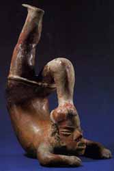 The "were-jaguar " Shamans were also associated and depicted in acrobatic poses, this represents the agility of the feline. Shamans were believed to have the ability to flip backwards and transform before they had landed. There have been a number a figures found , that incorporate acrobatic poses. In the statues 'Figure with feet on head' and "vessel in the form of a contortionist"a "WereJaquar" Shamans are shown in complex and complicated poses. The Shamans seems to very comfortable and achieve each pose with ease.