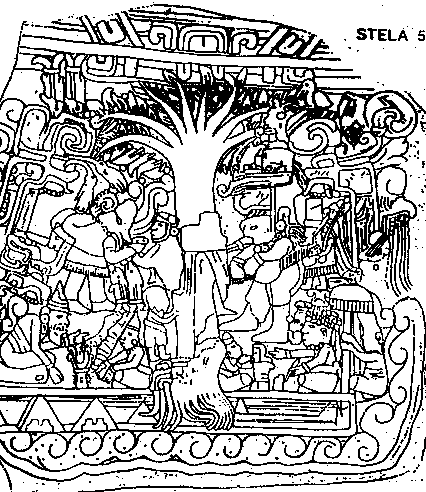 The tree depicts seven branches and twelve roots. The seven branches probably represent the seven major clans of the Olmec people. The twelve roots of the tree extending into the water from the boat probably signifies the "twelve roads through the sea", mentioned by Friar Diego Landa.