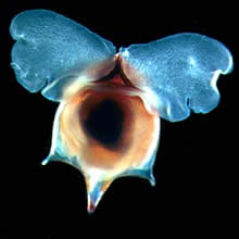 Among the tiny creatures studied was Cavolinia uncinata, a marine "wing-footed" snail 10mm long. These feed by making large feeding nets or bubbles to which food sticks as they sink through the water. They then suck in the net along with the food. |