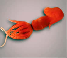 Enlarge this from the microscopic level to the big screen and you have something out of the Alien movies. This Phronima parasite is sticking its head of its house, the hollowed out living body of a salp, where it will eventually lay its eggs and raise its family. |